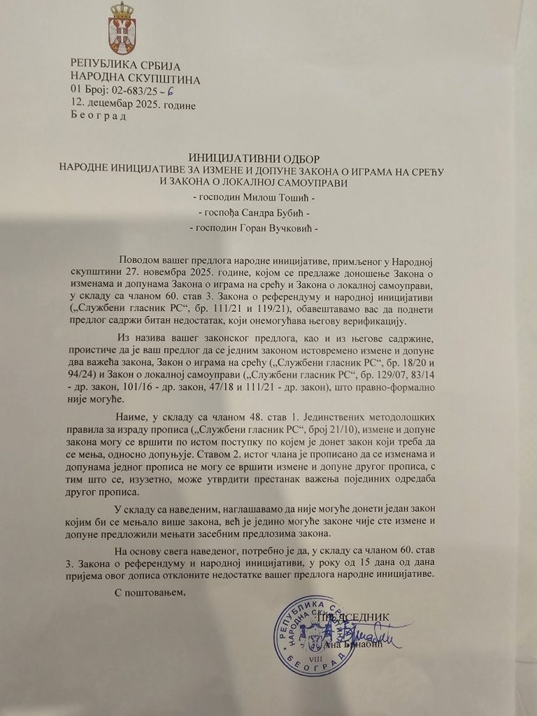 Преко викенда смо добили писмо од Народне скупштине, датирано на петак, 12. децембар (слика испод), којим нас обавештавају да наша народна иницијатива 11/2025 мора да се подели на засебне предлоге измена Закона о локалној самоуправи и измена и допуна Закона о играма на срећу, јер је оригинални предлог тражио измене оба закона кроз један предлог закона о изменама и допунама закона, што изгледа није дозвољено.