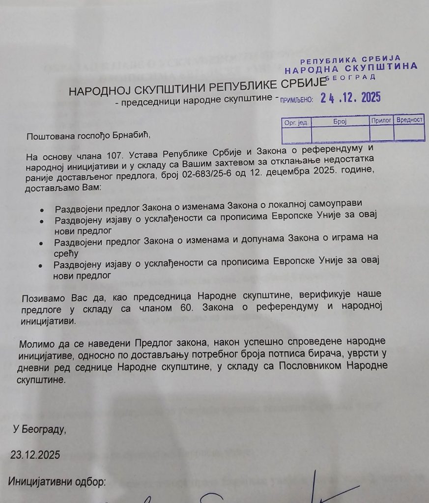 Данас је Милош, председник иницијативног одбора, предао Народној скупштини исправке народне иницијативе 11/2025 тражене раније овог месеца.