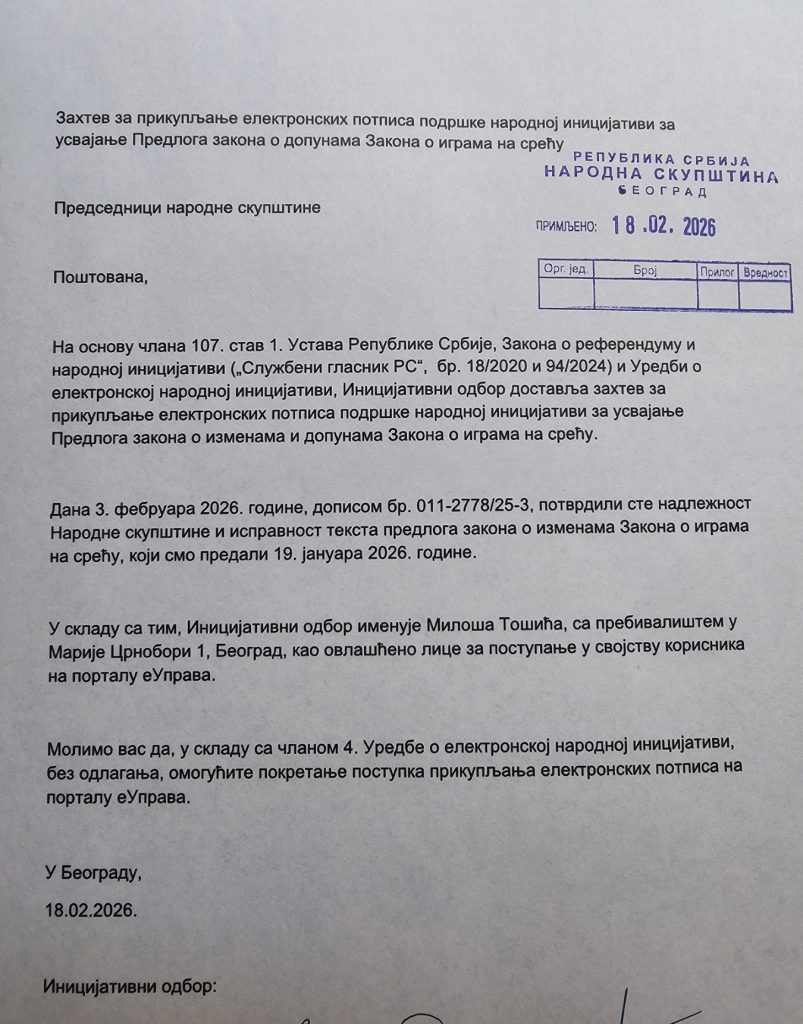Раније данас је Милош, председник иницијативног одбора, предао Захтев за отварање електронског потписивања народне иницијативе 01/2026 – и већ је добио административни приступ и поднео ПДФ документ на верификацију – тако да очекујемо да се и ова народна иницијатива врло ускоро појави на листи за потисивање, уз две постојеће из пакета 11/2025!