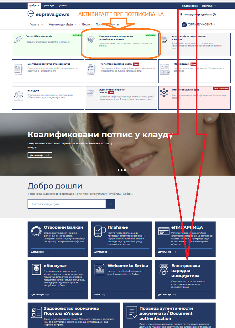 Плочица за улазак у на сајт за електронске народне иницијативе је обележена стрелицом, али пре тога активирајте квалификовани електронски сертификат за потписивање у клауду (плочица у средини на врху), ако већ нисте.